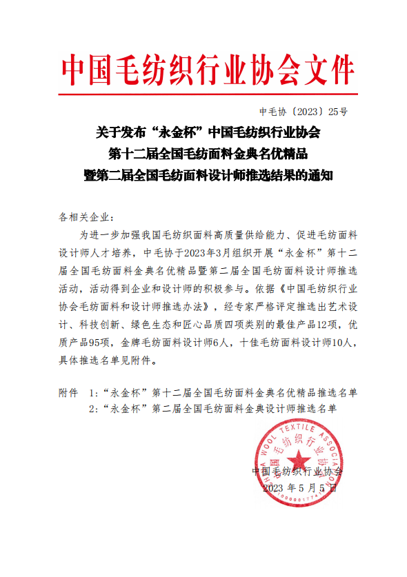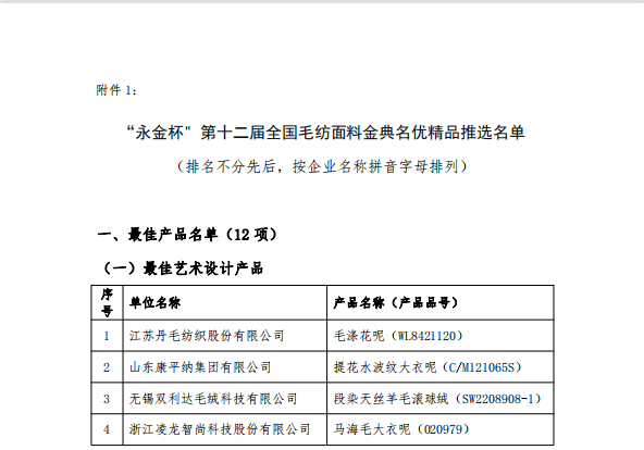 近日,在中國毛紡織行業(yè)協(xié)會組織開展的“永金杯”第十二屆全國毛紡面料金典名優(yōu)精品暨第二屆全國毛紡面料設(shè)計(jì)師推選活動中,山東康平納集團(tuán)有限公司推選的毛紡面料-榮獲“永金杯”--最佳藝術(shù)設(shè)計(jì)產(chǎn)品獎及匠心品質(zhì)產(chǎn)品獎”。